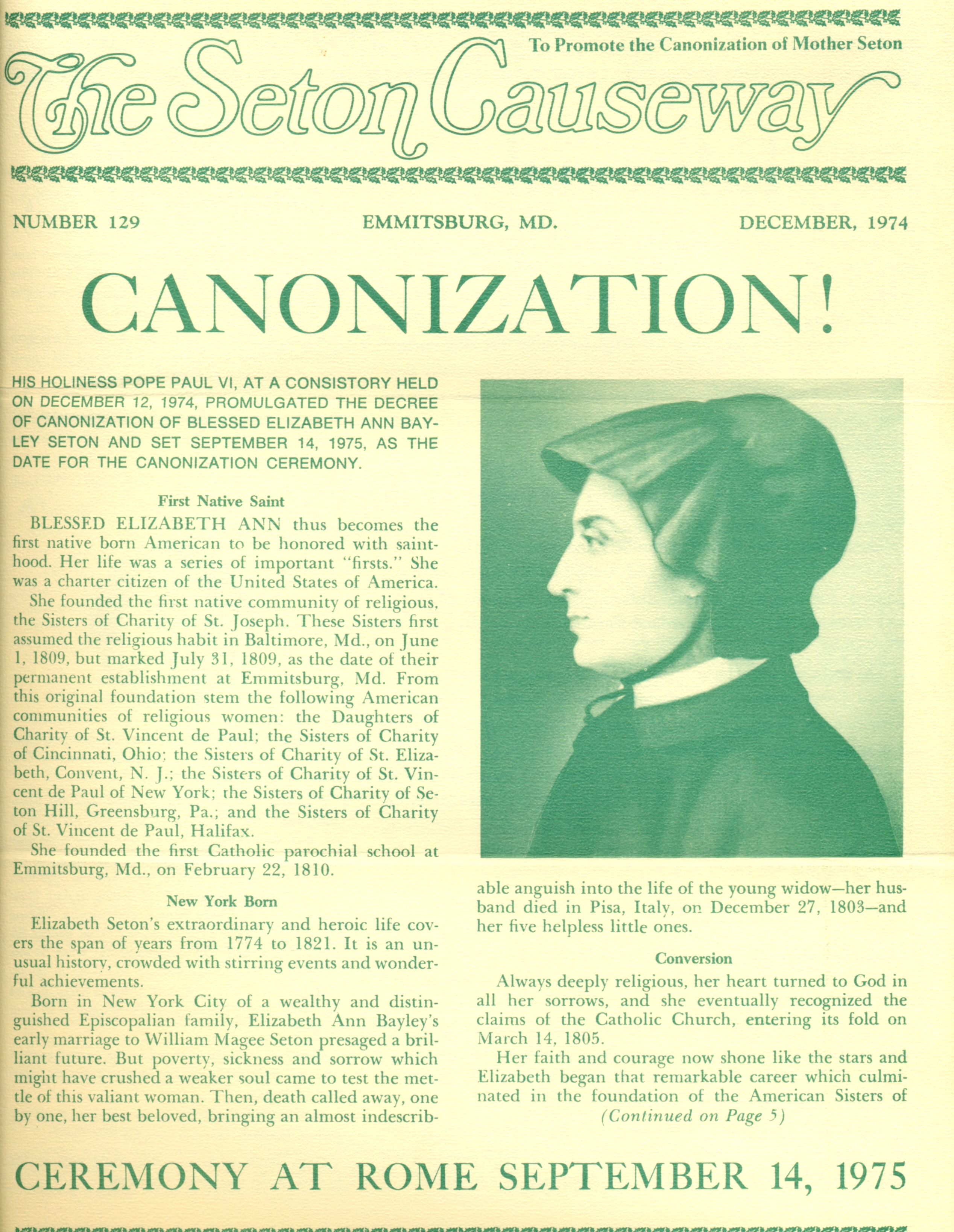 The photo seen here is taken from the December 1974 issue of the Seton Causeway, announcing that “Pope Paul VI, at a consistory held on December 12, 1974, promulgated the decree of canonization of Blessed Elizabeth Ann Bayley Seton and set September 14, 1975 as the date for the canonization ceremony.” Tomorrow’s post will include exerpts from the Seton Causeway‘s report on Mother Seton’s canonization ceremony.