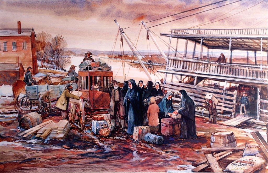 Sisters of Charity of Leavenworth, KS. “The Landing,” a painting depicting the arrival of the Sisters of Charity in Leavenworth in 1858. [“The Landing,” copyrighted by the estate of Ernst Ulmer, the artist]