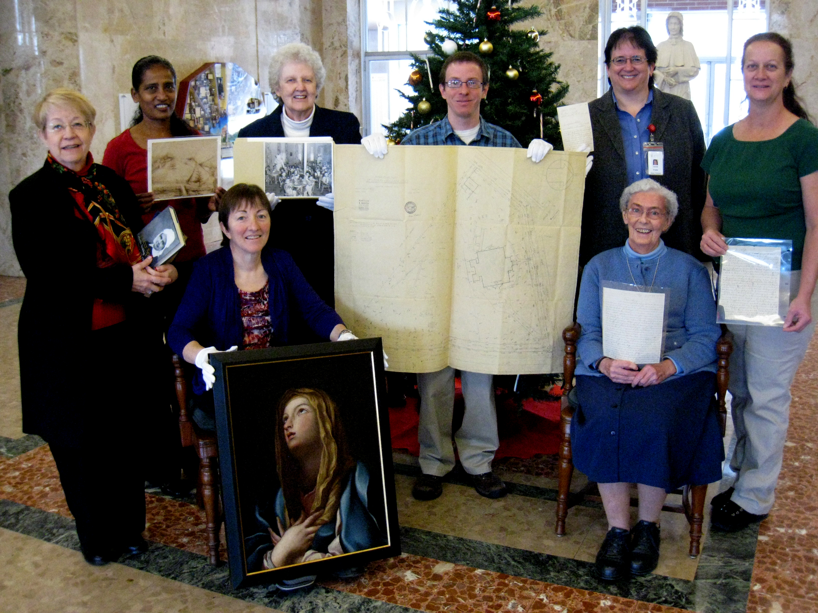 As our holiday greeting this year, the staff of the Daughters of Charity Provincial Archives decided to share some of our personal favorite items housed in our repository. Seated in front is Mary Anne Weatherly behind one of the art works owned by Elizabeth Ann Seton, Mater dolorosa, and Sr. Joan Angermaier who holds a letter she transcribed, one of 214 written between 1865 and 1904 by French Jesuit and Civil War chaplain Louis Gache to Sister Loyola Law. Standing (from the left) is Dee Gallo holding several histories of Sisters of Charity congregations, commemorating the new Federation Archivists initiative; Selin James with a sketch of the Sisters of St. Joseph’s property rendered in 1818 by Elizabeth Ann Seton’s spiritual mentor Rev. Simon Bruté; Sr. Rosa Lee Kramer holding several of the hundreds of photographs she processed from the collection of the former Albany province; Nik Henle displaying the 1955 site plan of St. Joseph-Gonzaga Home in Philadelphia; Carole Prietto with a letter dated April of 1896 from Sr. Mary Thomas Stockum, one of the four Daughters who started the Hansen’s Disease hospital at Carville, LA; and Bonnie Weatherly, holding one of the many Elizabeth Ann Seton autograph letters she has transcribed. From all of us in the Provincial Archives, sincere wishes for a meaningful Christmas and a bountiful 2014.
