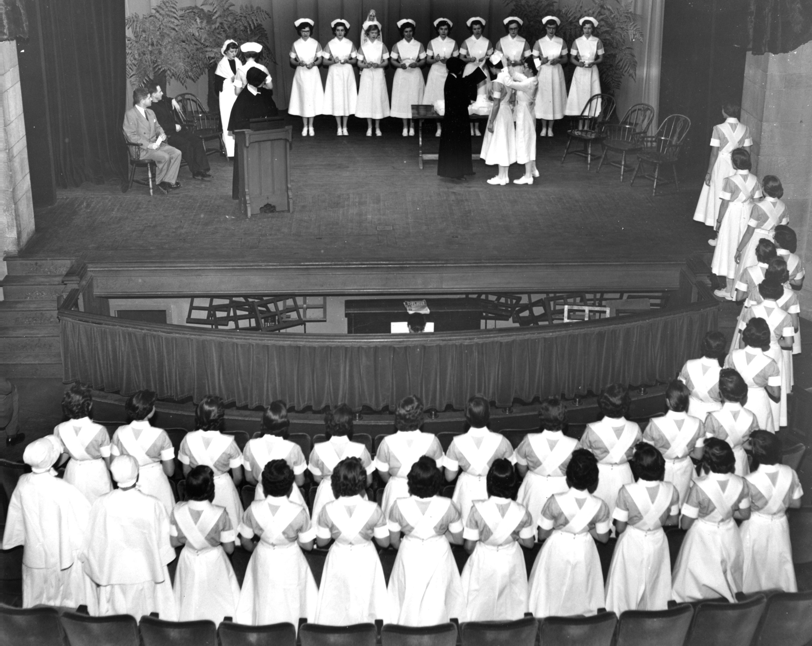 Since concentrating on Catholic Schools week the last week of January, the Archivist of the Sisters of Charity decided to look back in the history of the Sisters in Health Care. The School of Nursing in the first general hospital established by the sisters was started in 1905. Below is a picture of a capping ceremony in the middle ‘50’s. The School of Nursing closed in 1976.