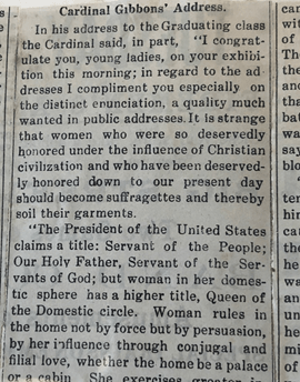 Gibbons was influential in both the American and global Church, but his beliefs on the subject were not solely his. During the 1912 graduation, Archbishop Corrigan of Buffalo, who decried that “Women are making a great stir in Chicago,” calling for society to “Let her be pure and chaste in family life, true to instincts of Christian womanhood. Her most natural place is at the head of her family; let her not desert it.” At the same time as he acknowledge that the Church had not made a decision on the matter, he also stated that “If she had this privilege she would not be happier, nor would she enjoy more peach than she does now.”[13]