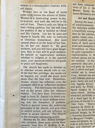 In this same year, Father Patrick McHale Provincial of the Eastern Province of the Vincentians, seemed to try and split the difference, praising an accomplished woman as a mathematician and chairholder at a university, while also praising in the same sentence “the true woman [who] fulfills her mission and returns home.” Ultimately, his assessment of the cause seems to land on “The tendency today is to take woman from her position; “Woman Suffrage” for example. A word here will suffice. If there is need to vote, let woman cast the ballot and then return where she belongs.”[14]