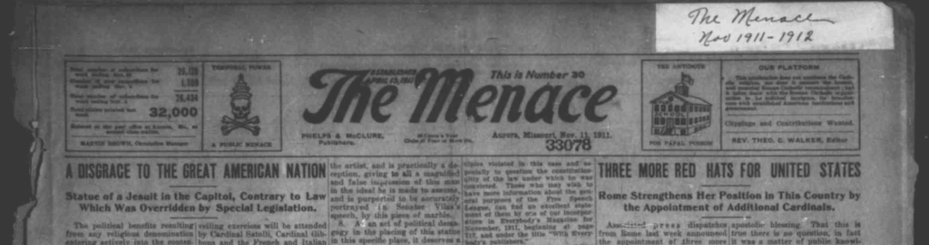 Just as Father Walsh’s comfort with women’s greater involvement with the world came at the heels of World War I, where women had entered the industrial workforce in ways not seen before, so too, did another. In many part of America, anti-German and anti-immigrant sentiment was growing. A strong portion of this was a resurgence of old anti-Catholic sentiment. Newsletters like The Menace spread across the country, depicting Catholic schools as places where children were victimized, and proper Protestant families were broken up by shadowy anti-American figures.[3]