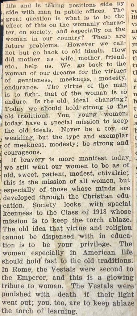Although calling for women to “hold strong to the old traditions” and “keep the old ideals,” Father Walsh also recognized the need for feminine strength and courage in combining old roles with new ones; a small opening in the evolution of women’s rights and status rather than an immediate dismissal toward the movement that Cardinal Gibbons had previously espoused.