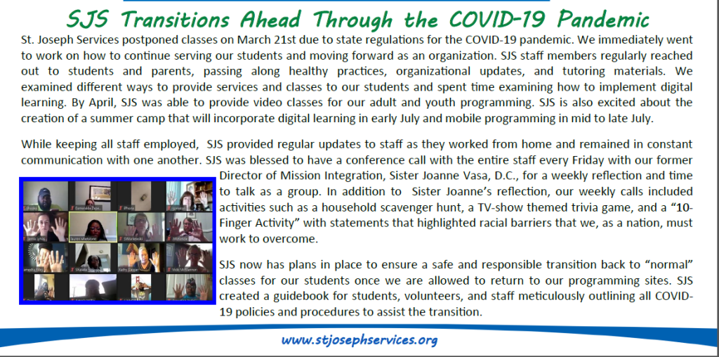 - The Daughters operate St. Joseph Services in Chicago, which puts out a quarterly newsletter (in both English and Spanish). They discuss the changes that occurred to their programming due to the pandemic and how they continue to serve the city.
