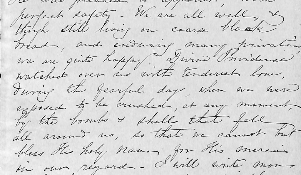 We are all well, & though still living on coarse black bread and enduring many privations, we are quite happy. Divine Providence watched over us with tenderest love during the fearful days when we were exposed to be crushed, at any moment, by the booms & shells that fell all around us, so that we cannot but bless His holy names for His mercies in our regard.”
