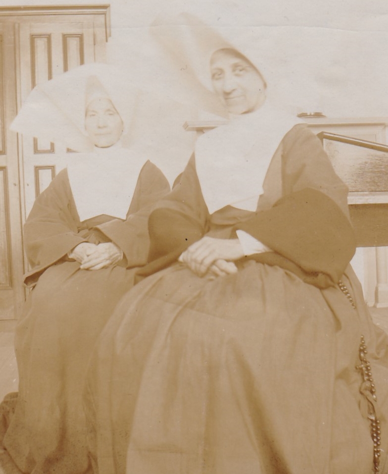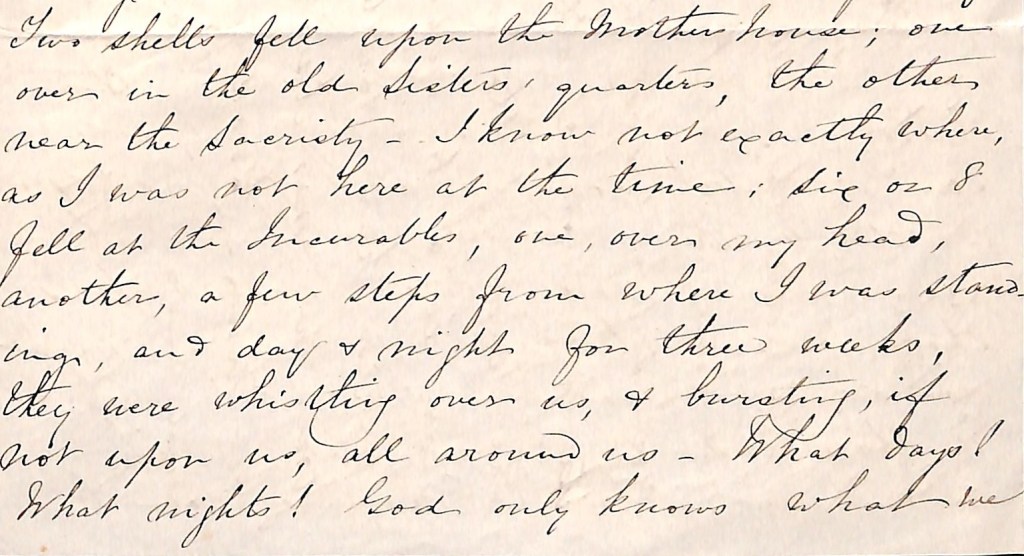 “Two shells fell upon the Mother House; one over the old Sisters quarters, the other near the Sacristy. I know not exactly when as I was not here at the time. Six or 8 fell at the Incurables, one over my head, another a few steps from where I was standing, and day & night for three weeks, they were whistling over us & bursting, if not upon us, all around us. What days! What nights! God only knows what we went through, but his eye was upon us, in the midst of the trials & his arm kept the bombs from touching us.”