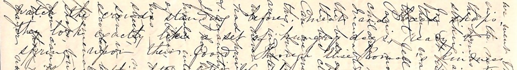 “During the siege how changed it was – not a carriage to be seen in the streets, not a dog or horses & dogs only to be seen in butchered shops, no happy children escorted .by their nurses, no fashionable promenaders, stores closed, even bakers’ shop, towards the last, no gas at night, you cannot imagine what Paris was in those sad days, nor is it much gayer now; it would amuse you to watch the crowds standing before meat and bread shops. They look exactly like a set of hungry dogs, ready to spring upon their food.“