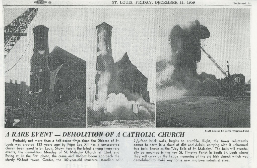 Archbishop Ritter had advocated integration in the schools before the Supreme Court Brown v. Board decision, and the end of segregated schooling offered a happy ending for the children and their educations. A 1957 account in the collection attested that “because the children of our families are now permitted to attend white schools, their families are moving into better neighborhoods.” This did not mean that the old neighborhood saw an end to its neglect, however. Whether it was described as “slum clearing” or “urban renewal,” the effect was the same when, in 1959, almost 20,000 residents were removed and much of the neighborhood – including St. Malachy Parish – was demolished. https://news.stlpublicradio.org/show/st-louis-on-the-air/2018-03-01/remembering-mill-creek-valley-once-home-to-20-000-black-st-louisans