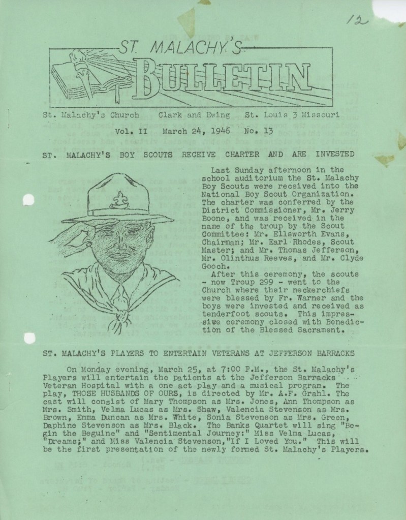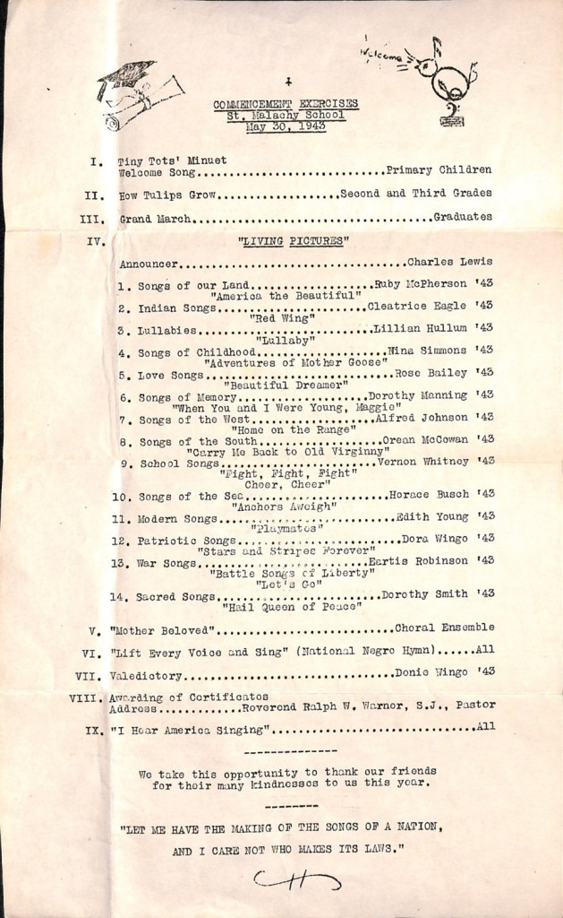 The narrative accounts of St. Malachy and the neighborhood all depict African Americans from a white point of view, but this does not mean that the collections are devoid of information that directly provides pieces of information about individual members of Mill Creek’s African American residents. While there are no surviving class lists in the collection, programs of events provide names of students along with their graduating year. Other publications reflect the pride of taking part in the school and parish communities and demonstrate a proud and successful Black Catholic parish.
