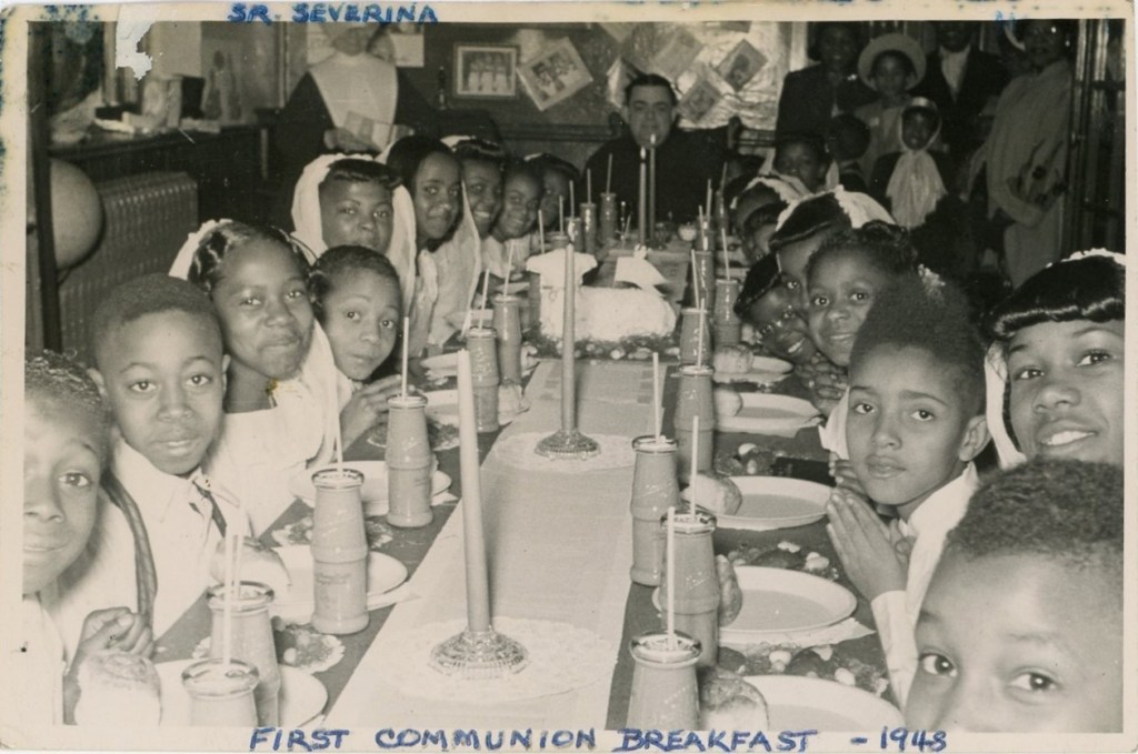 Sister Aurelia [Hogan] had trained her summer school catachumens well, and the neophtes [sic] followed suit. The older boys brought out saw-horses on which they placed boards, making two long tables, while benches and chairs were quickly hauled forward. The children, smaller ones first, formed in a single line leading toward the counter, at which seven W.P.A. [Works Progress Administration] colored workers dished up a steaming hot dinner. We marveled at the order maintained, for though each child received his portion and immediately walked to his place, not one touched a morsel until the entire table – about fifty children had been seated. Then, with heads reverently bowed, they said Grace in unison, and ate dinner. Poor hungry children! Father informed us that this was the only “square” meal some of them got all day. It was furnished in part by the W.P.A. surplus commodity program, while Father supplied the rest with whatever financial assistance he was able to procure from charitable benefactors.