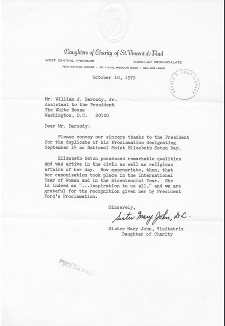 In the more modern day, and as a preview of things to come, the National Archives is also in possession of the official proclamations from the U.S. government about Mother Seton’s canonization. Under Press Secretary William Baroody’s files, held at the Gerald Ford Presidential Library, is the official proclamation of Elizabeth Ann Seton Day, alongside a signed thank you letter from Sister Mary John Lindner for the community’s replica copy, signed by President Ford. This replica will be on display next year (2025) for our exhibit “One of Us” at the Seton Shrine, celebrating the 50th anniversary of this event!