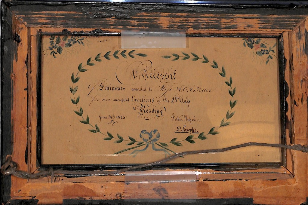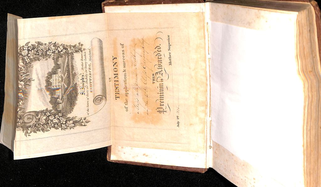 While the number of surviving student mementos from Mother Seton’s era are limited, they become more voluminous as time goes on until St. Joseph’s Academy received a charter as St. Joseph College in 1902. Other markers of the students’ work include “premiums,” which are what would be called in the modern day certificates of achievement or small awards for top performers in the class in different subjects.