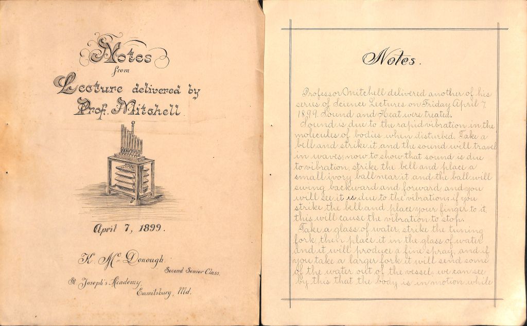 A handful of these additional “Scrapbooks” from the Academy exist across the middle of the 19th century. Other materials address the education provided by the Academy more directly. Katherine McDonough’s lecture notes from 1899 show an average day of education in science, geology, and grammar.