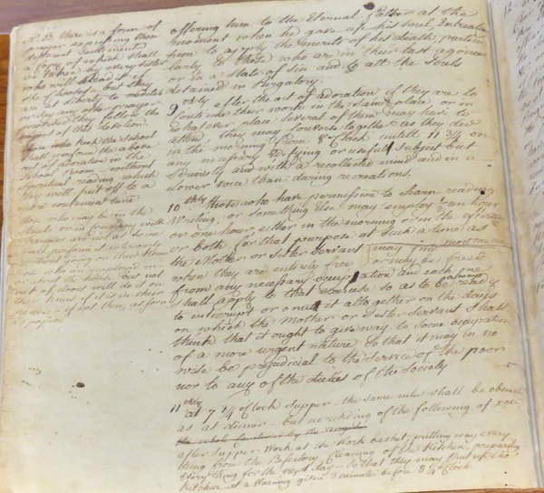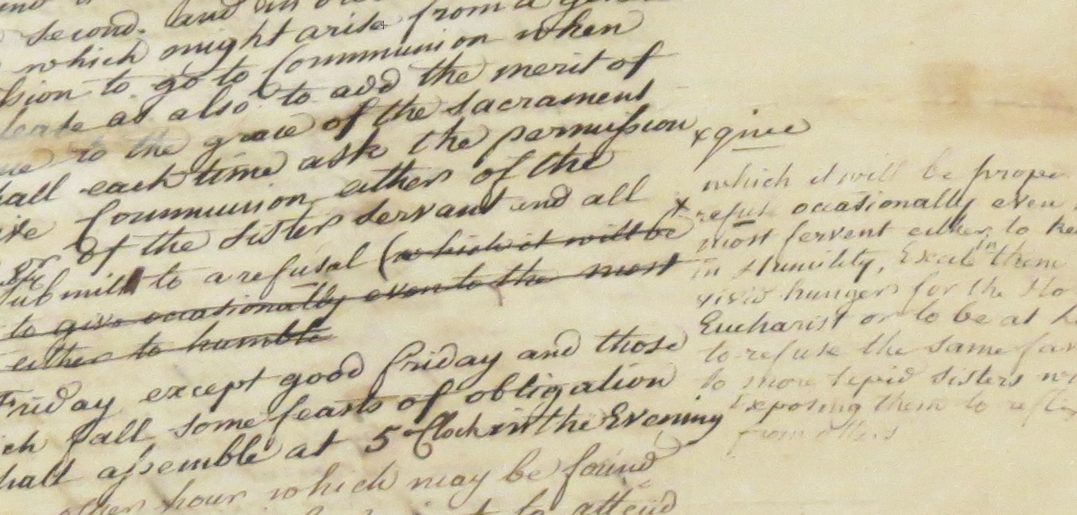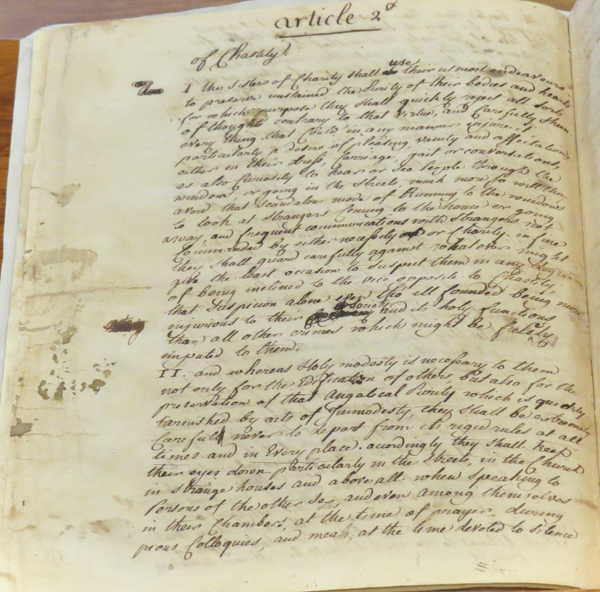 In an effort to share the Rule as widely as possible, we have put together the digital exhbit seen here, consisting of photographs of selected pages from the Rule. All images are used with permission of the Daughters of Charity Provincial Archives. The images seen here show seven of the book’s approximately 60 leaves.