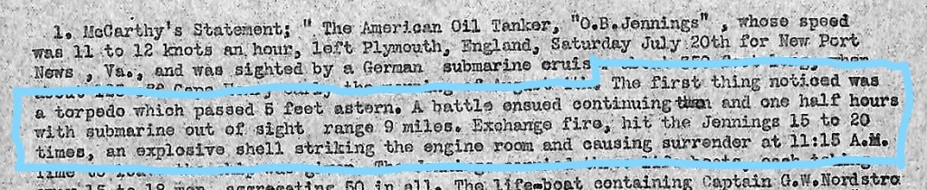 This extra detail is fascinating in knowing how close of a call the S.S. O.B Jennings was in at the beginning of the surprise attack by the German submarine. Lebern’s quick thinking was able to both alarm the S.S. O.B. Jennings of an attack while also alarming others to maneuverer the vessel just to the point of barely dodging the power of a torpedo. The other details before and after this command were the same as McCarthy’s report.