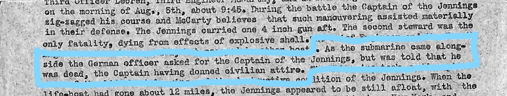 The events that occurred next were suspenseful: the Captain of the defeated S.S. O.B. Jennings was able to narrowly escape capture by the German soldiers by disguising himself as a civilian. According to the report, “As the submarine came alongside the German officer asked for the Captain of the Jennings, but was told that he was dead, the Captain having donned civilian attire”.