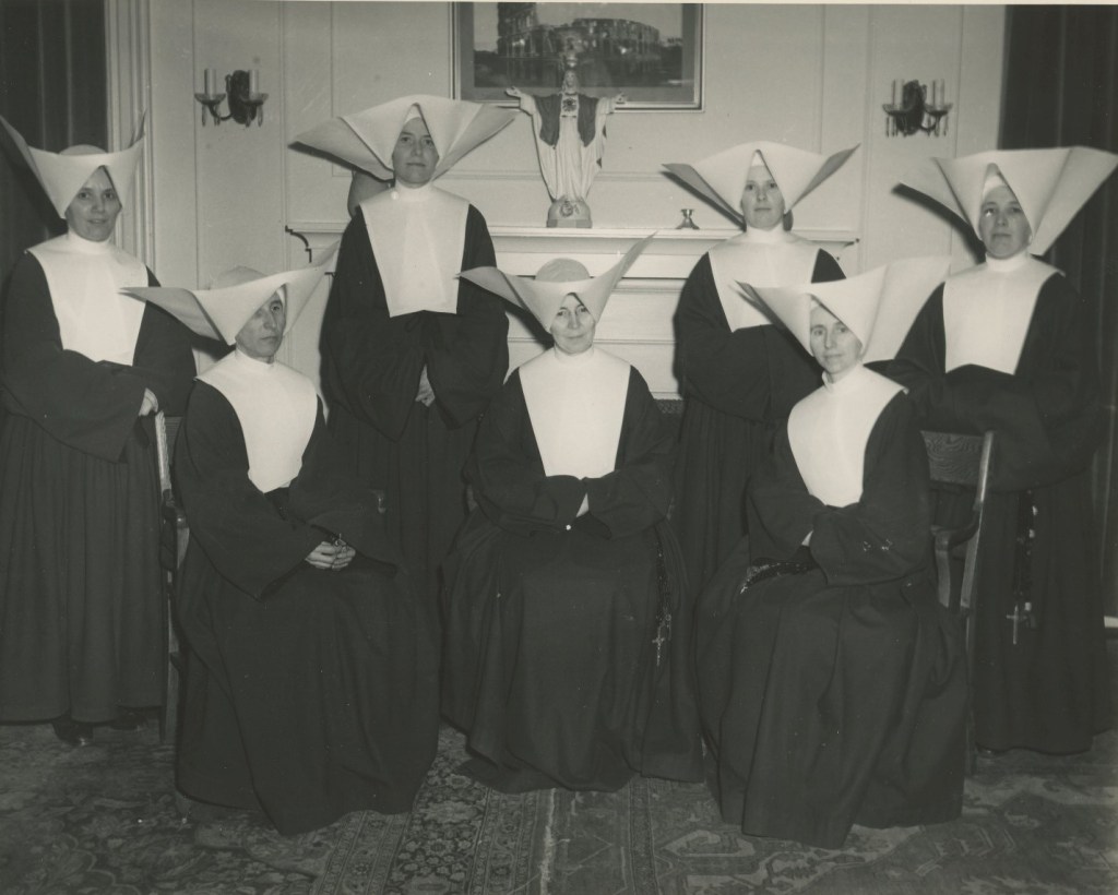 Sisters Isabel Toohey and Mary Basil Roarke (seated, middle and right) travelled north from Emmitsburg for the installation of the first five French sisters in Sherbrooke