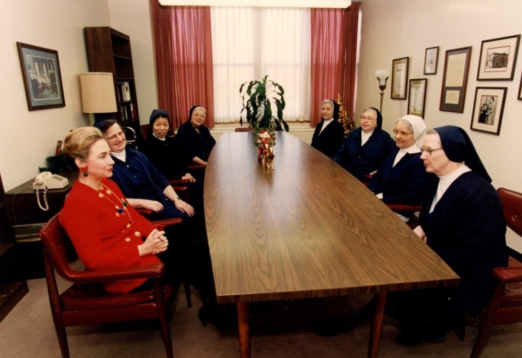 Sisters of St. Ann’s Center for Children with First Lady Hillary Clinton. Left from Clinton: Sisters Catherine Fitzgerald, Marie Cecile Nguyen-Thi-Ven, Mary Helen Edelen, Teresa Buckley, Paula McGuire, Mary Clement Hemler, Josephine Murphy