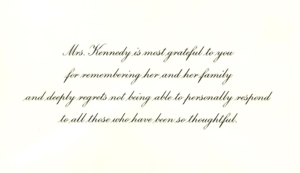 Jackie Kennedy was the first Roman Catholic First Lady. Her husband’s last rites were administered by Father Oscar Huber, C.M., the pastor of Holy Trinity Parish in Dallas, Texas. The Daughters taught at the parish school and collected the students’ condolences to give to the First Lady. She responded with a kind note of thanks.