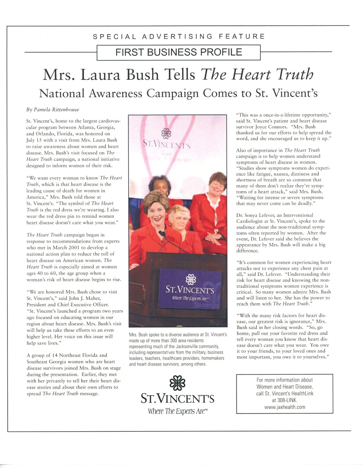 As a part of a campaign to combat heart disease, and in celebration of the work in the cardiovascular field, First Lady Laura Bush stopped by St. Vincent’s Hospital in Jacksonville.