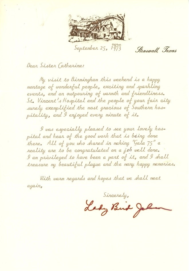 As the Daughters rallied around President Johnson’s War on Poverty, they also remained close with the First Family. After President Lyndon passed away in 1973, only a few years after leaving office, Lady Bird was on hand to unveil a memorial plaque at St. Vincent’s Hospital in Birmingham, Alabama as part of the 75th anniversary of the hospital. Gracious as always, the former First Lady penned a personal thank-you note after the gala weekend!