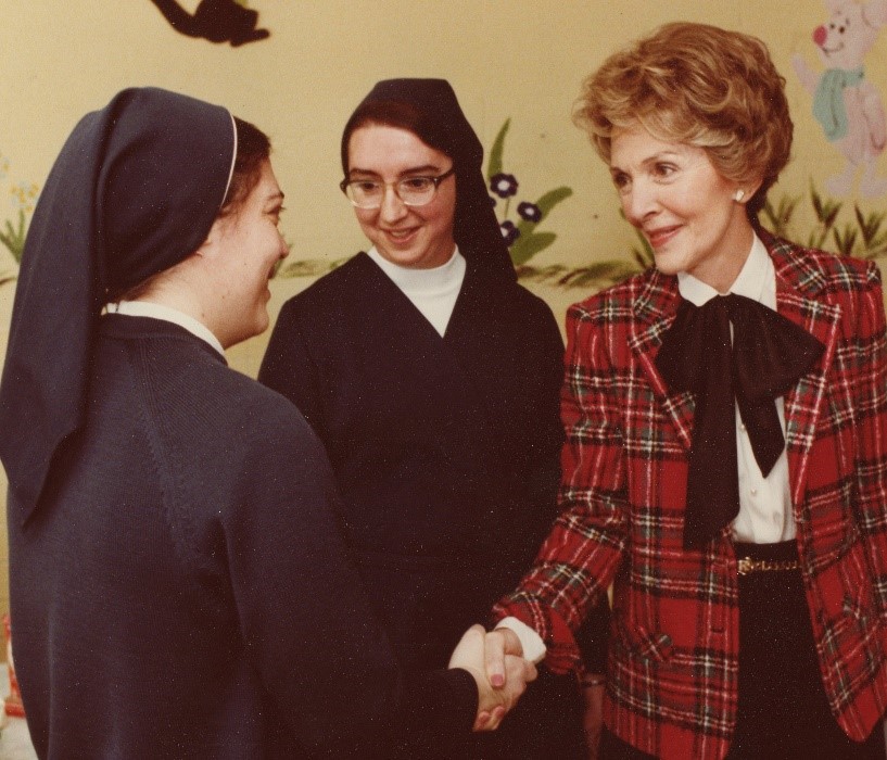 First Lady Nancy Reagan shakes hands with Sister Margaret Ann Wooden, then a Child Care Supervisor, as Head Administrator Sister Elyse Staab looks on.